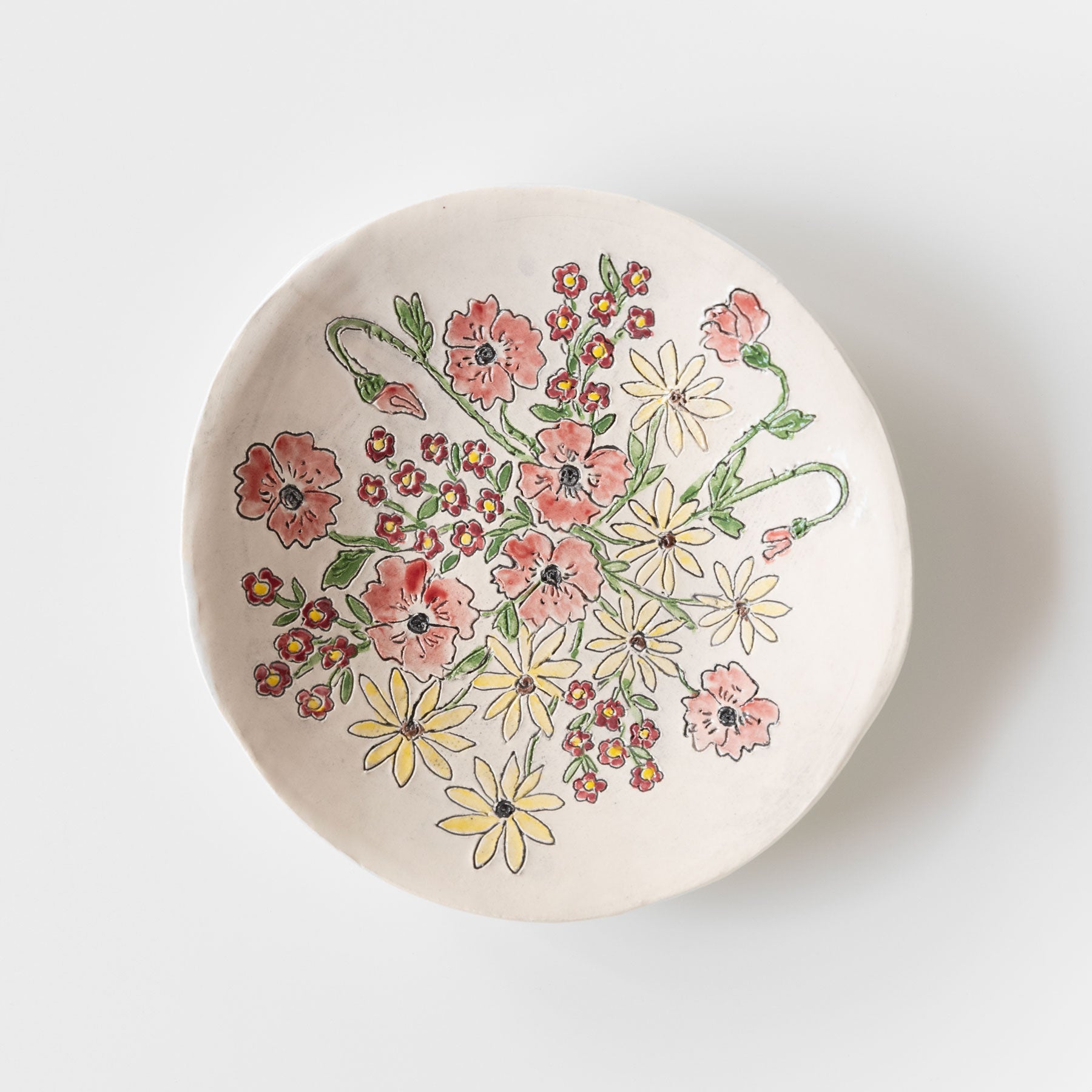 This lovely plate features a hand-carved and hand-painted floral motif. A special piece that can either be placed on display or put to use. Each piece is unique and the design varies slightly.