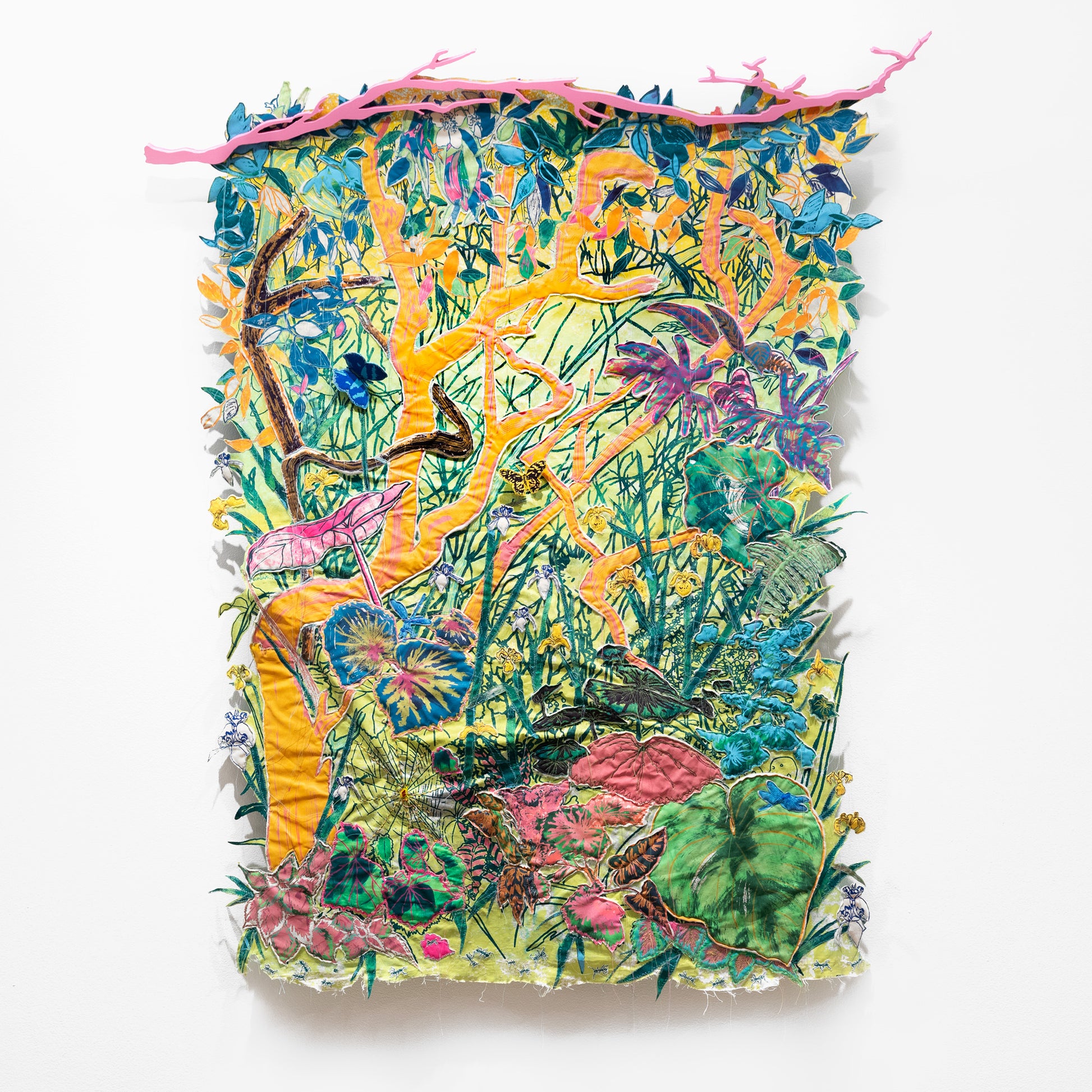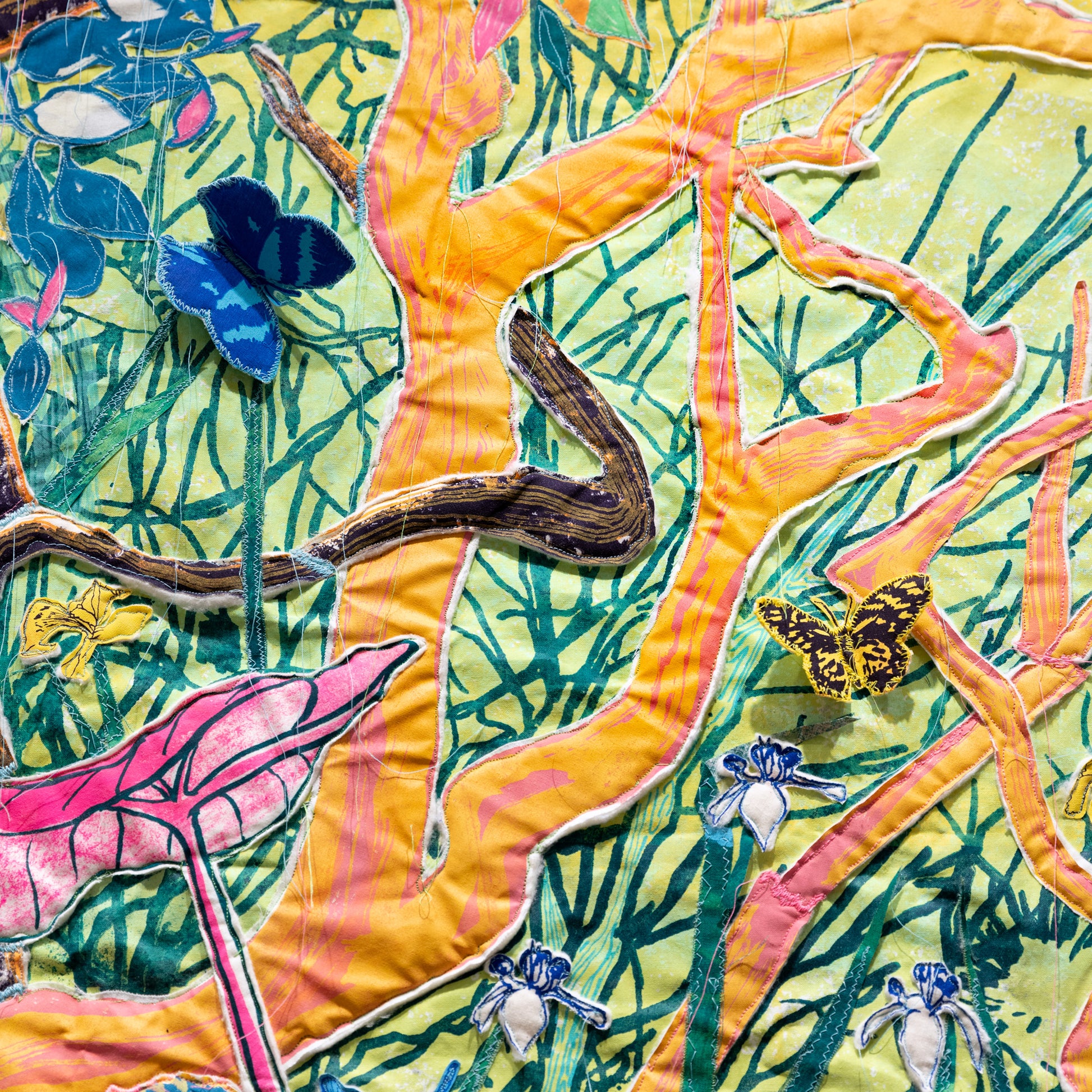 Immersed in this world, I lost myself among the countless stitches, the mountains of fabric scraps and batting, and swirling ink textures. Through my craft, I am slowly mending the wounds caused by the abrupt departure from the place where I grew up. I am threading new paths, in a different home, while learning to navigate through the ongoing tension and uncertainties forever tied to my country of birth.